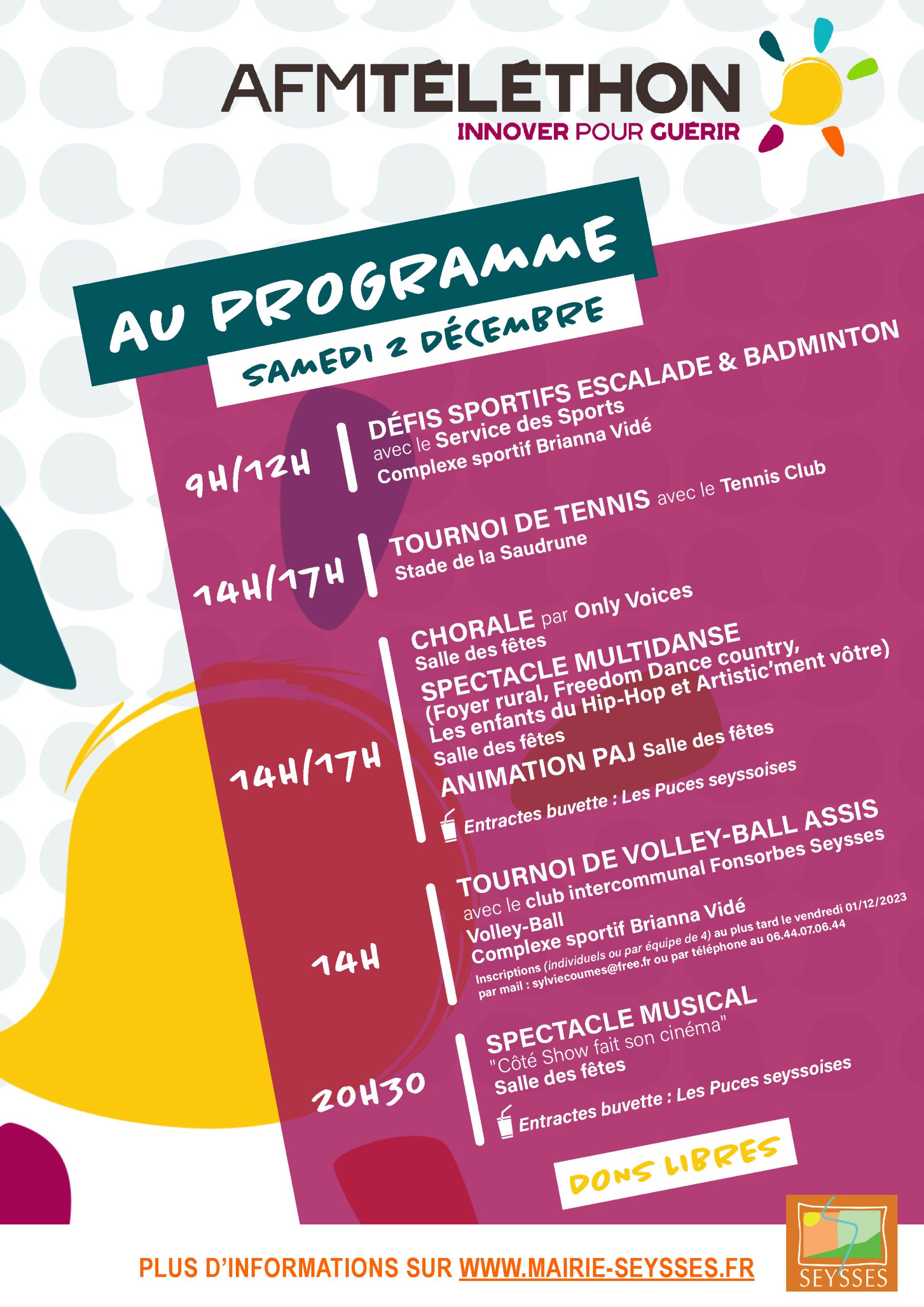 La municipalité de Seysses organise une journée Téléthon le samedi 2 décembre 2023. Programme :