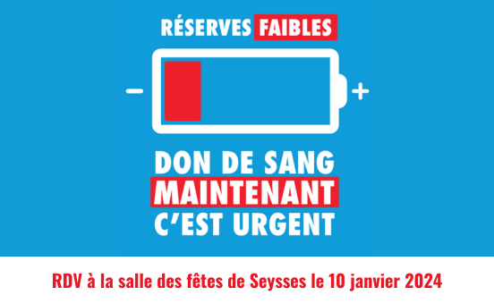 Donnez votre sang lors de cette collecte qui se déroulera le mercredi 10 janvier de 9h à 13h et de 14h à 19h à la salle des fêtes. La prise de rendez-vous en ligne est privilégiée : cliquez ici. Une pièce d’identité avec photo est obligatoire pour tous les donneurs....