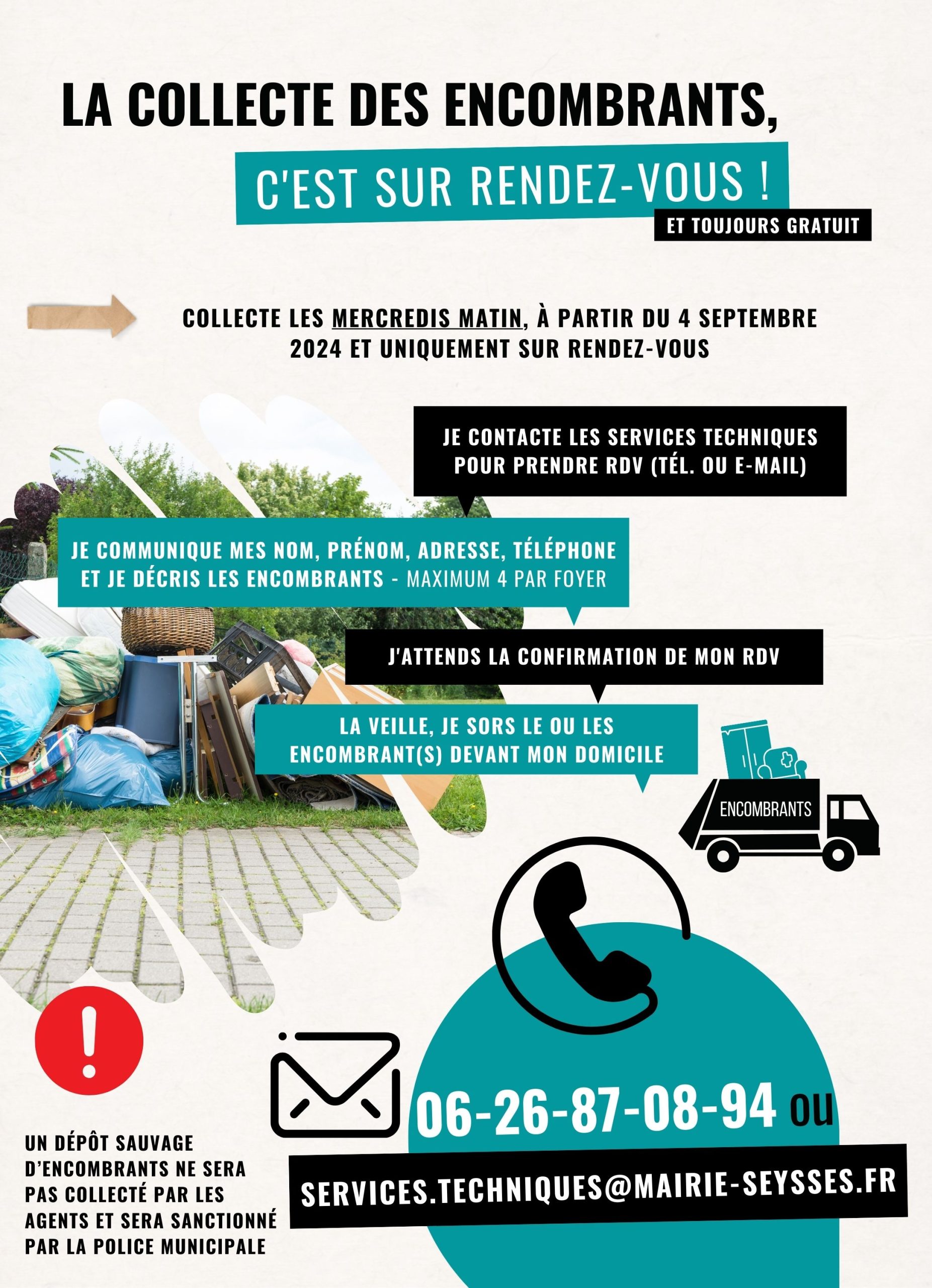 La collecte des encombrants a été revue fin 2021 afin de répondre au mieux aux besoins des Seyssois. Ainsi, celle-ci s’effectue sur rendez-vous, gratuitement, auprès des services techniques en appelant le 06 26 87 08 94 ou en envoyant un e-mail à encombrants@mairie-seysses.fr.