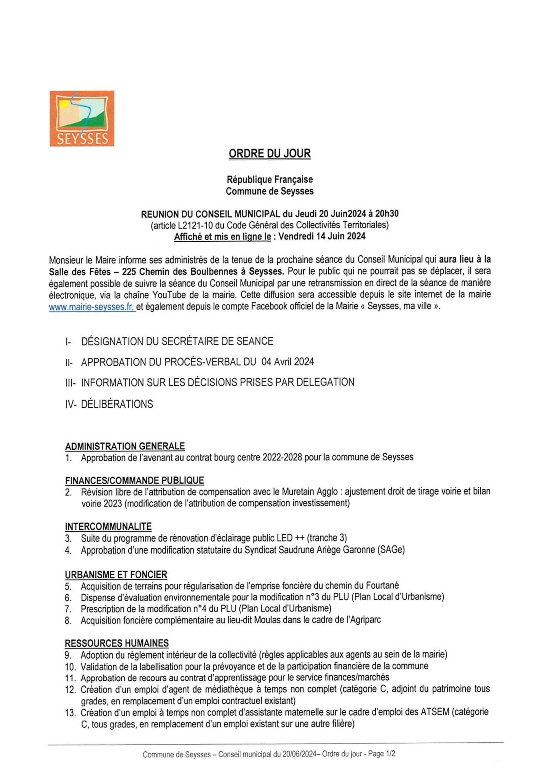 Le dernier Conseil Municipal a eu lieu le jeudi 20 juin 2024 à 20 h 30, à la Salle des Fêtes.