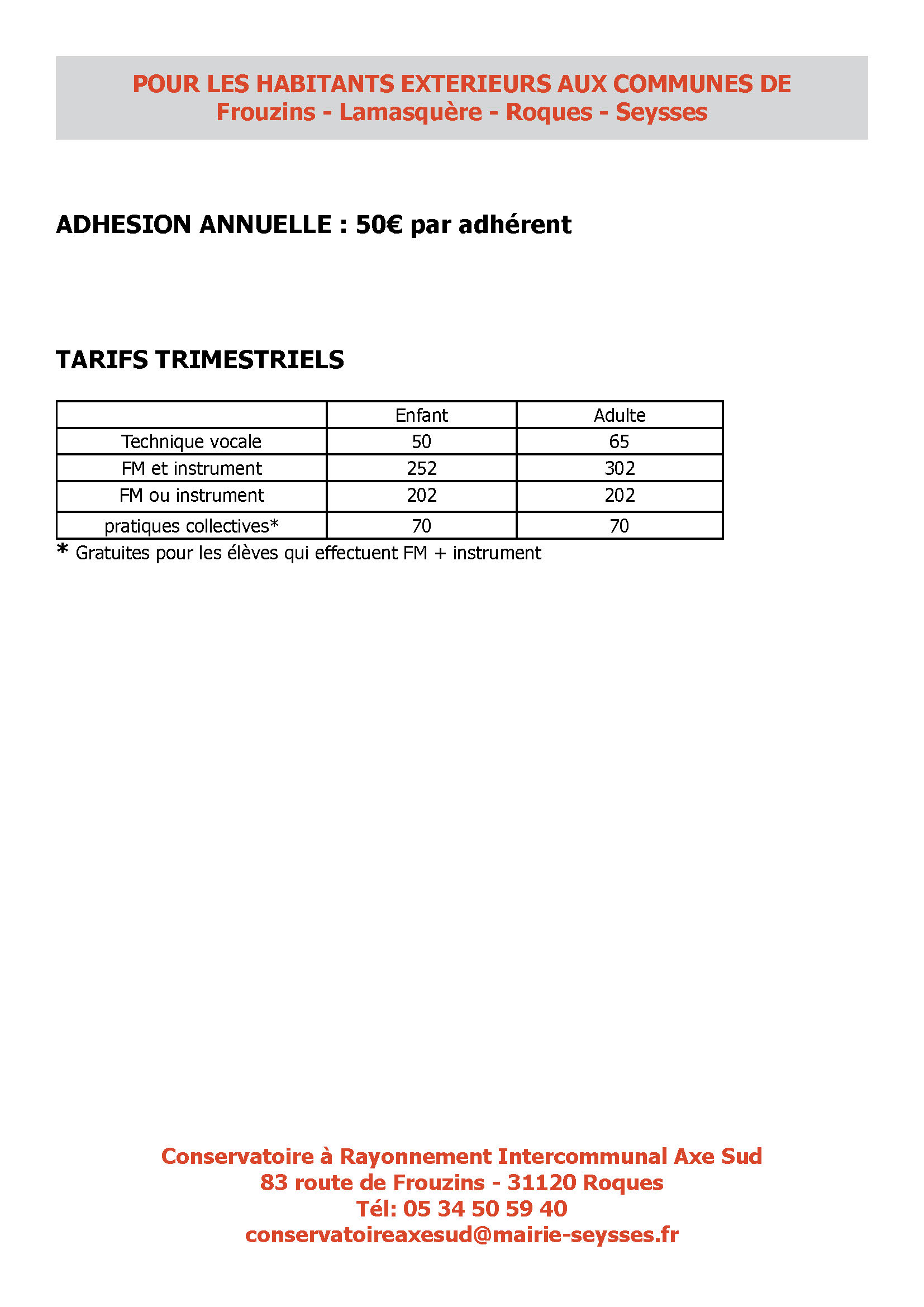 L’accès au Conservatoire s’adresse en priorité aux personnes résidant sur les communes de Frouzins, Lamasquère, Roques et Seysses. Les personnes extérieures à ces communes sont accueillies selon les places disponibles.