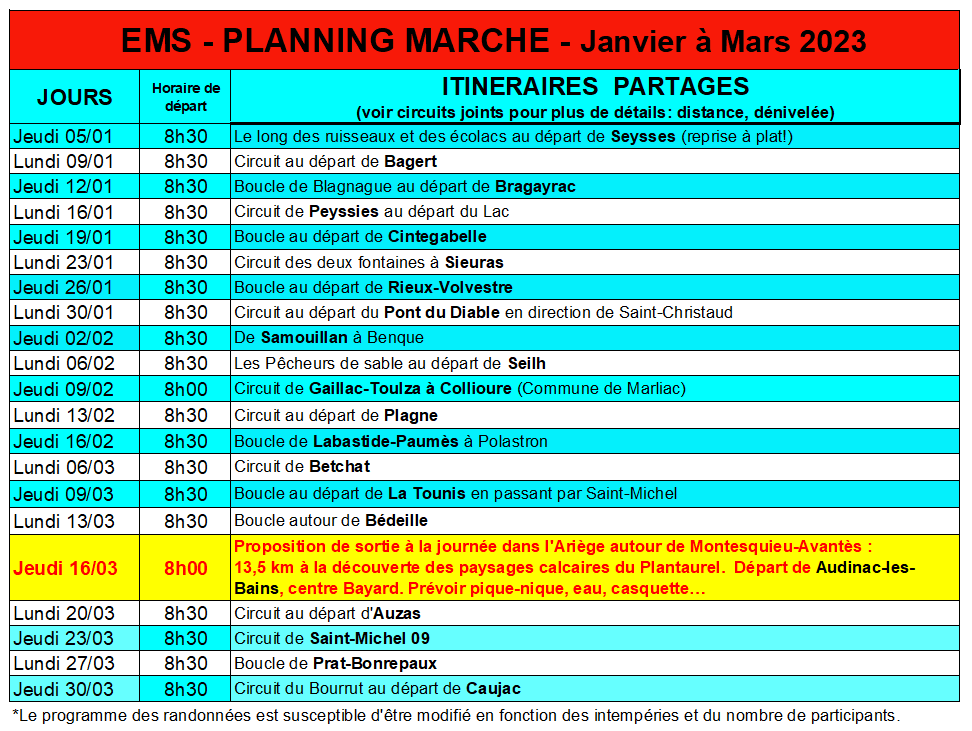 Accueil » Culture, Sports & Loisirs » École municipale des sports » Planning marche EMS janvier à mars