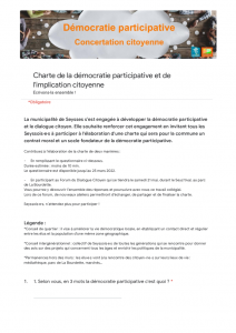 La commune de Seysses s’inscrivant dans une démarche de démocratie participative et du dialogue citoyen, les élus souhaitent mettre en place une charte de démocratie participative en co-construction avec les habitants de la ville.