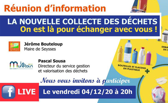 Le vendredi 4 décembre 2020 à 20h, les Seyssois·es étaient invités à participer à une réunion d’information concernant la mise en place de la nouvelle collecte des déchets. Ce premier Facebook live a permis de vous présenter la nouvelle organisation et de répondre à vos questions.