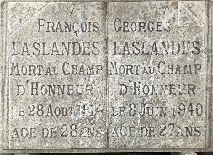 Comme son fils père François, il mourra au champ d’honneur au début de la 2ième guerre mondiale le 8 juin 1940. Une plaque évoque leur mémoire sur le caveau d’Eugène Lacoste leur cousin au cimetière
