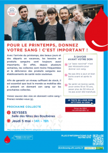 Continuons à nous mobiliser pour le don du sang ! Rendez-vous le 5 mai de 14h à 19h à la salle des fêtes de Seysses.
