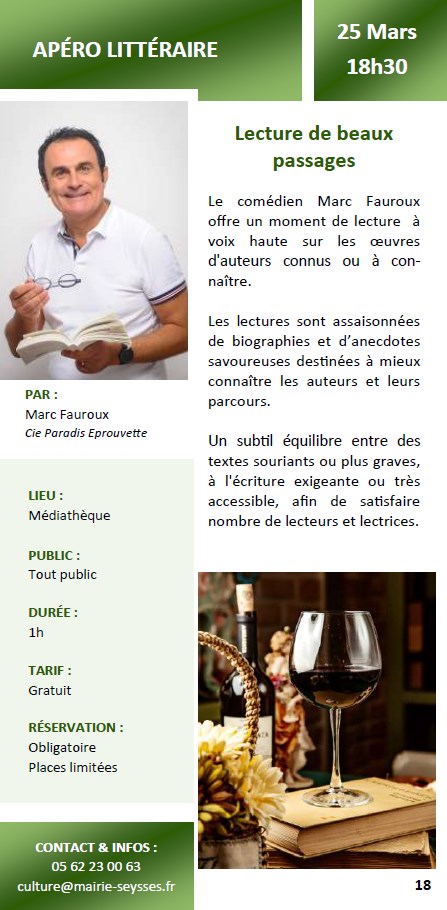 Service Culturel : 05 62 23 00 63 / culture@mairie-seysses.fr