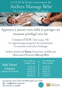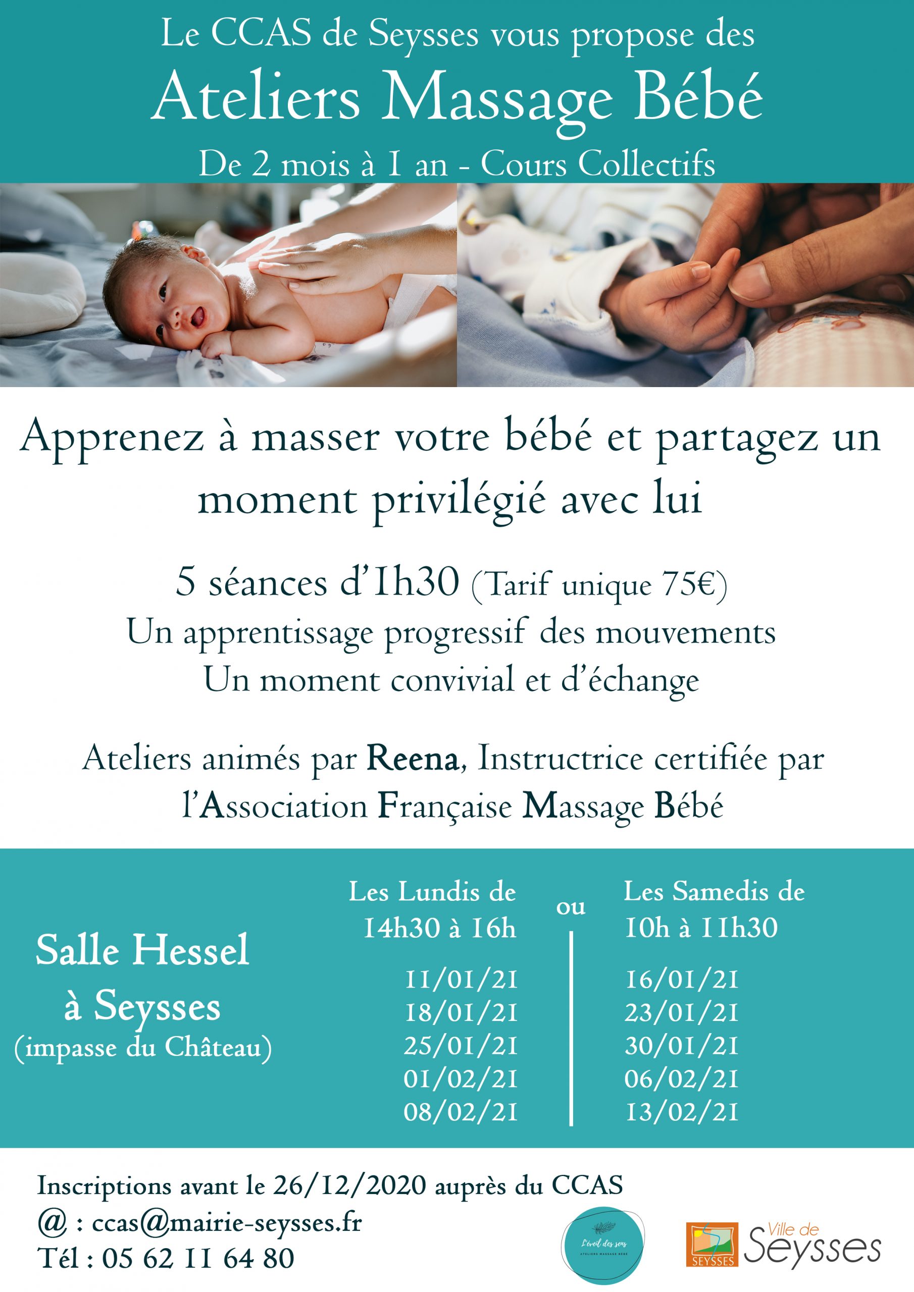 « Tous les Évènements Cet évènement est passé. Atelier massage parent/bébé samedi 30 janvier 2021 - 10:00 à 11:30 75€ « Les permanences de votre Maire Atelier massage parent/bébé » Plus d’infos d’un clic ici Ajouter au calendrier Google Agenda iCalendar Outlook 365 Outlook Live Détails Date : samedi 30 janvier 2021 Heure : 10:00 à 11:30 Prix : 75€ Catégorie d’Évènement: Vie municipale & CCAS Lieu Salle Stéphane Hessel impasse du château Seysses, 31600 + Google Map Organisateur C.C.A.S Téléphone 05 62 11 64 80 E-mail ccas@mairie-seysses.fr