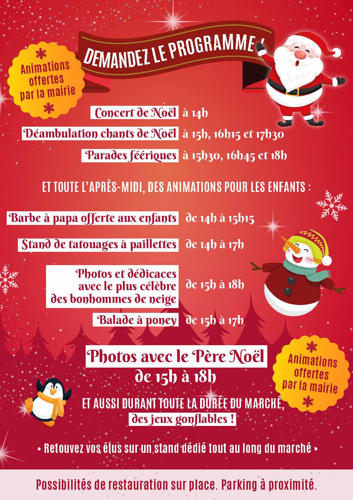 Quant au marché, la municipalité vous a préparé un programme digne de la magie des fêtes de fin d’année, à retrouver au Parc de la Bourdette de 14 heures à 19 heures :