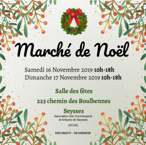 « Tous les Évènements Cet évènement est passé. Marché de Noël de l’A.C.A.S samedi 16 novembre 2019 à dimanche 17 novembre 2019 « Marché de plein vent Jeux en réseau » samedi 16 et dimanche 17 novembre de 10h à 18h Ajouter au calendrier Google Agenda iCalendar Outlook 365 Outlook Live Détails Début : samedi 16 novembre 2019 Fin : dimanche 17 novembre 2019 Catégorie d’Évènement: Associations Lieu Salle des fêtes 225 chemin des Boulbennes Seysses, 31600 France + Google Map Organisateur Association des Commerçants et Artisans de Seysses (A.C.A.S) Téléphone 06 14 69 48 39