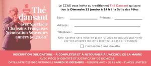 Inscription obligatoire avant le 31 décembre en retournant le coupon présent dans l’Echo du Binos ou ci-dessous à l’accueil de la mairie. Merci d’apporter votre pièce d’identité et un justificatif de domicile lors du dépôt du document.