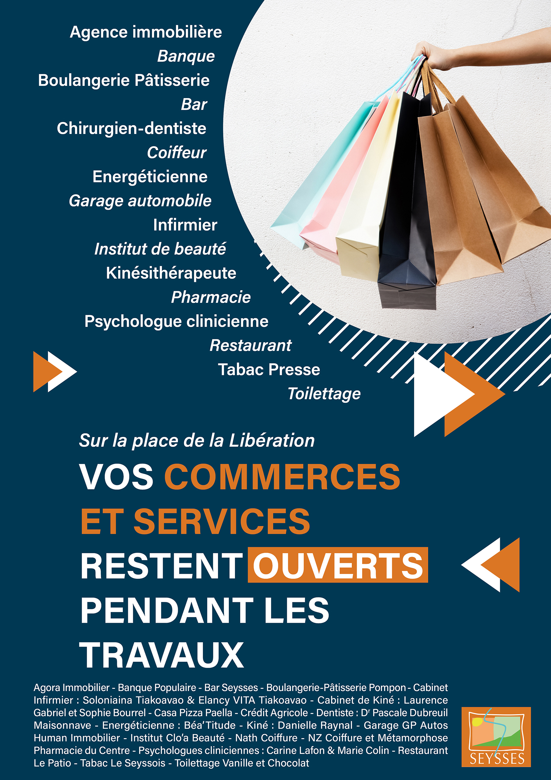 Les commerces et services du centre-ville restent ouverts et accessibles pendant toute la durée des travaux !