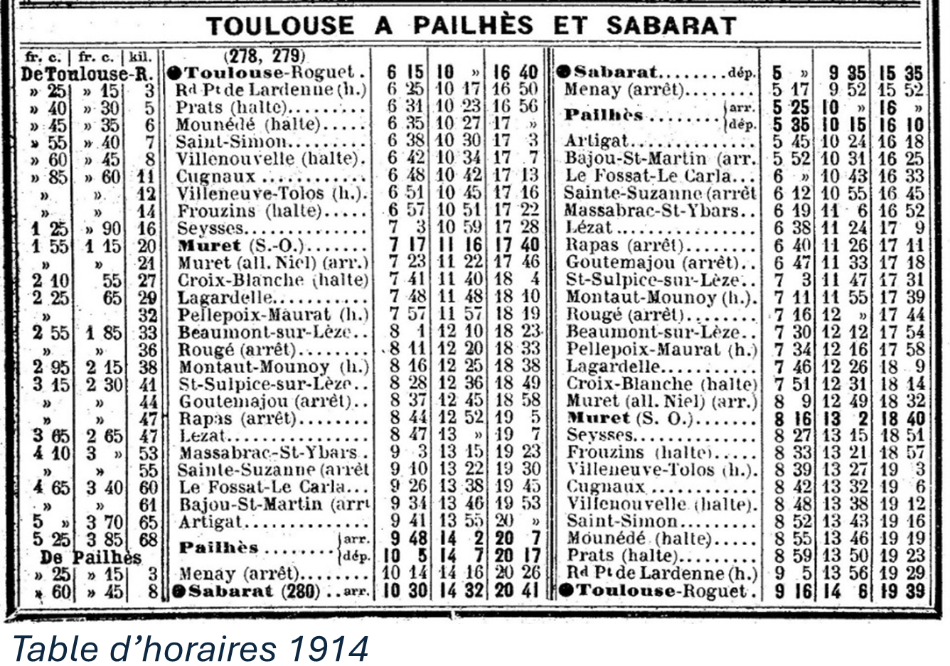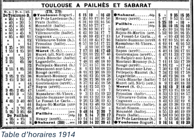 Ce service fut réduit à deux, dès le début des hostilités et, au début de la période de guerre, à un seul aller-retour (dont l’horaire variait) pour permettre aux voyageurs, soit de passer une journée à Toulouse, soit aux Toulousains d’aller une journée à la campagne.