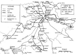 • PO/Midi : lignes gérées par les compagnies Paris-Orléans et les chemins de fer du Midi (ancêtres de la SNCF) • SO : lignes gérées par la compagnie des chemins de fer du Sud-Ouest • V.F.D.M. : Voies Ferrées Départementales du Midi
