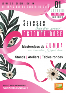 Seysses bouge pour Octobre Rose ! A l’occasion de la journée de sensibilisation au dépistage du cancer du sein le samedi 1er octobre, le CCAS a mis en place une masterclass de zumba en collaboration avec l’association « Esprit danse », des stands et ateliers de prévention avec le centre de santé « AGIR » mais aussi des tables rondes sur le sujet.