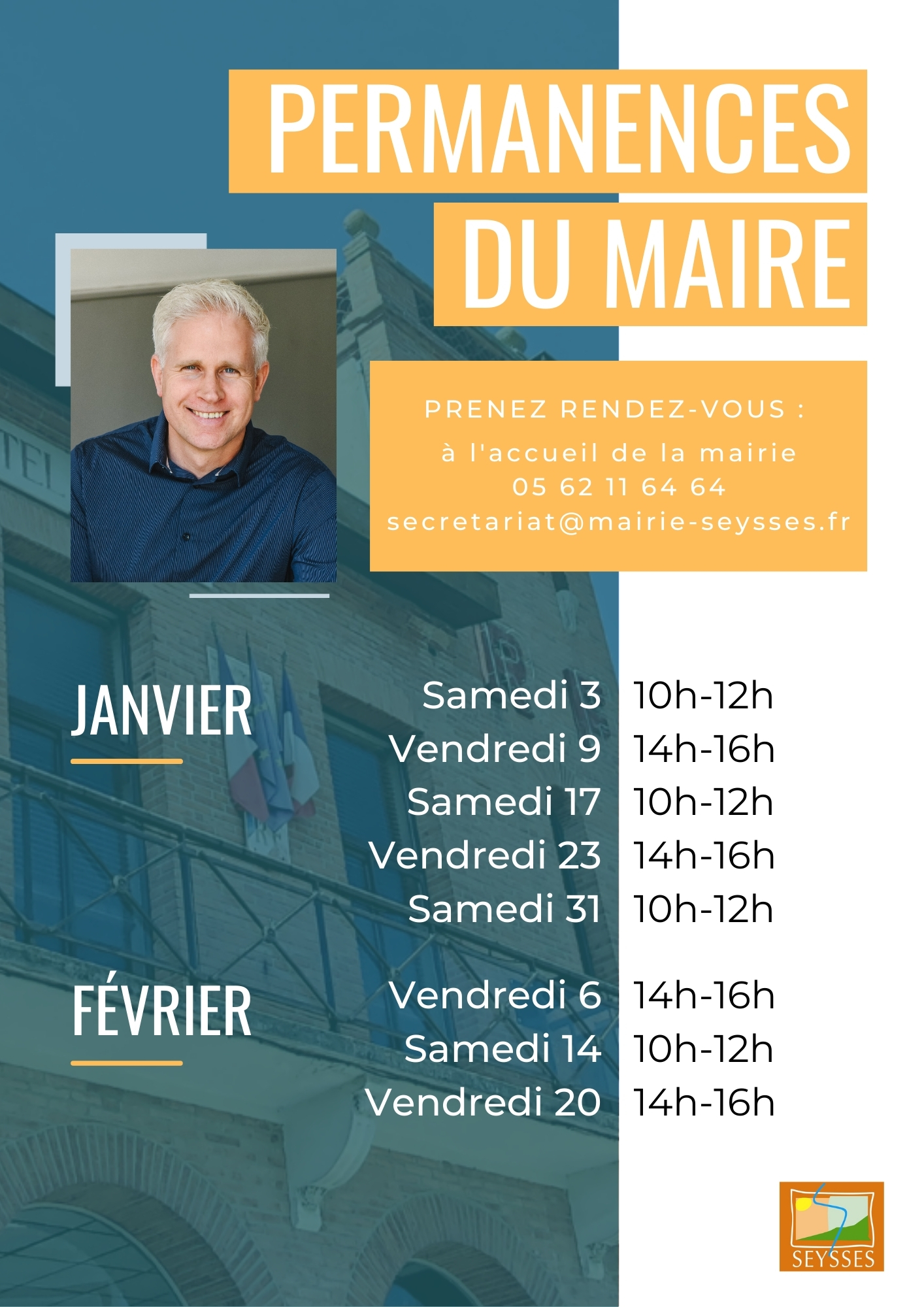 Pour réserver une entrevue, veuillez contacter l’accueil de la mairie au 05 62 11 64 64 ou envoyer un mail à secretariat@mairie-seysses.fr