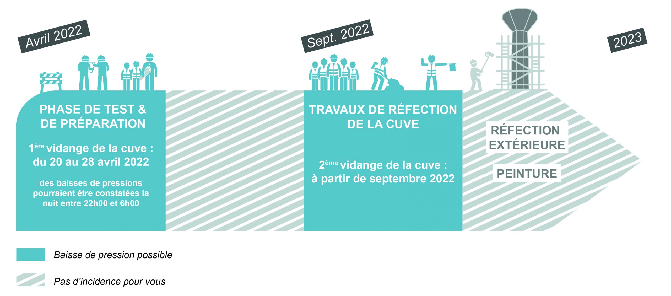 Une première vidange de la cuve du château d’eau sera effectuée du 20 au 28 avril, ce qui pourrait entraîner une diminution de la pression d’eau entre 22h et 6h.